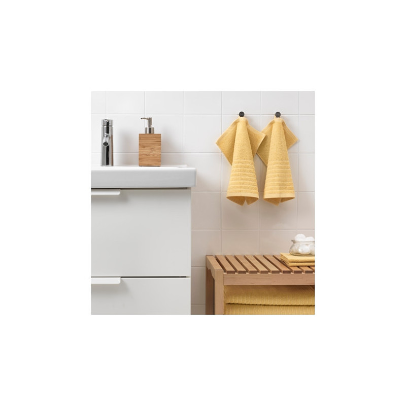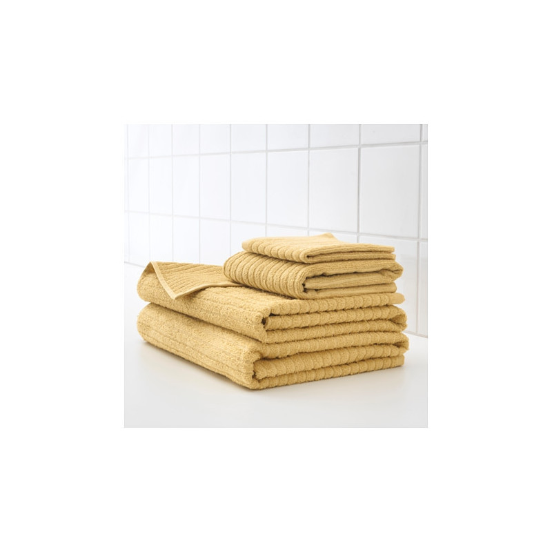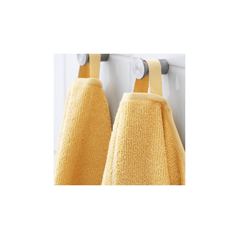 جنس حوله های حمام شاید در ظاهر خیلی شبیه یکدیگر باشد اما کافی است دستی بر آنها بکشید و کمی سبک و سنگینشان کنید تا ببینید تفاوت از زمین تا آسمان است. گاهی بعضی از حوله های حمام وزنی شبیه یک فرش دارند و زبر هستند. این مشخصه می تواند خیلی راحت به شما اخطار بدهد که « این حوله، حوله مناسبی نیست و از مواد خوب و باکیفیت تهیه نشده است. حوله زرد رنگ ایکیا مدل VAGSJON شامل 4 عدد حوله با قدرت جذب بالای رطوبت به اندازه 390 گرم بر مترمربع میباشد. هرچه چگالی سطحی حوله بیشتر باشد قدرت جذب آن بالاتر میرود. بیاد داشته باشید که استفاده از نرم کننده در هنگام شستشوی حوله ها از قدرت جذب آنها میکاهد.