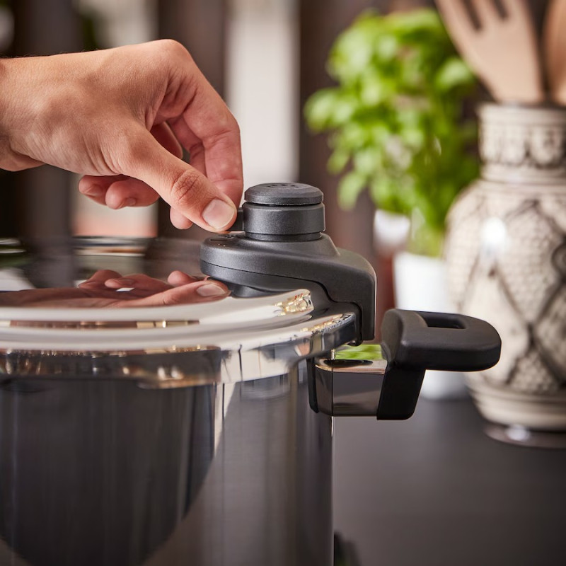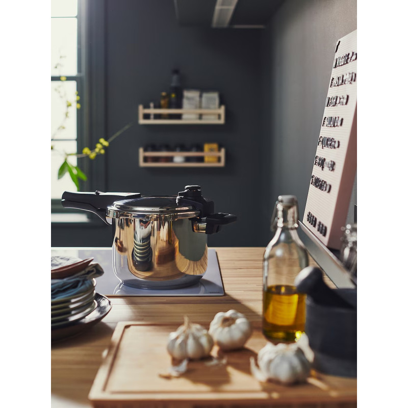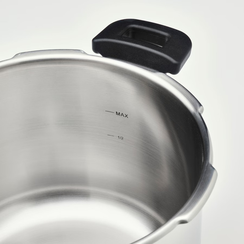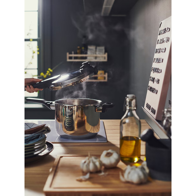 زودپز استیل IKEA365  دارای رگلاتور فشار میباشد که اگر فشار از حد تعیین شده بالاتر برود به شما هشدار میدهد و امکان آزاد کردن بخار هنگام پخت را دارد که موجب کاهش فشار و باز شدن درب زودپز به راحتی میشود. پایه ضخیم با یک لایه آلومینیومی بین دو لایه فولاد ضد زنگ عملکرد و گرمای موثری دارد که خطر سوزاندن و چسبیدن غذا را کاهش میدهد. مقیاس اندازه گیری داخلی موجب ایجاد فشار داخلی متناسب با مابع داخل آن میشود. زودپز ایکیا براحتی با دو دست بلند میشود و بدلیل جنسی که دارد راحت تمیز میشود.