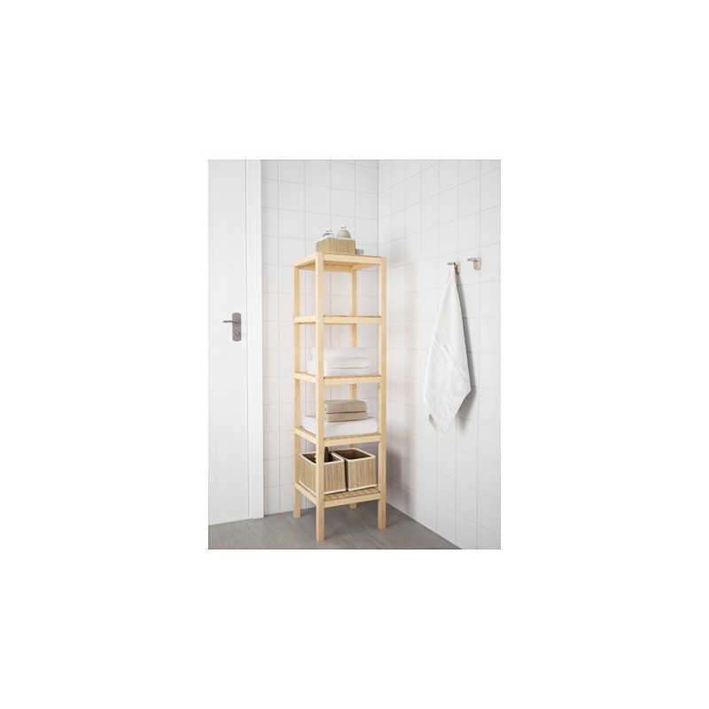 عدم وجود نظم و بهم‌ریختگی لوازم در حمام یکی از بزرگ‌ترین دغدغه‌های هر بانوی خانه است. زیرا مرتب کردن آن ممکن است زمان زیادی بخواهد. برای کنترل نظم در حمام‌ها داشتن یک قفسه برای نگهداری لوازم یک امر ضروری است. باید تمام شامپوها، صابون‌ها، لیف‌ها و سایر لوازم در یک قفسه نگهداشته شوند تا از بهم‌ریختگی جلوگیری شود. بهتر است که این قفسه از چند طبقه تشکیل شده باشد. پیشنهاد ما به شما قفسه حمام ایکیا مدل MOLGER دارای 5 طبقه است. این قفسه‌ی حمام از چوب بوده و نیازی به نصب ندارد. این قفسه‌ی حمام دارای ابعاد 37 × 37 × 140 سانتی‌متر بوده و مناسب برای انواع لوازم شست‌وشو است. به راحتی می‌توانید این قفسه را گوشه ای از حمام یا سرویس خود قرار دهید و دیگر نگران بهم‌ریختگی محیط حمام نباشید. قفسه حمام ایکیا در عین سادگی طراحی زیبایی داشته و با اشغال کمترین فضا بهترین وسیله برای حمام است.  راز موفقیت این برند اهمیت به کیفیت و زیبایی محصولاتش است که با وجود طراحان حرفه‌ای میسر شده است.