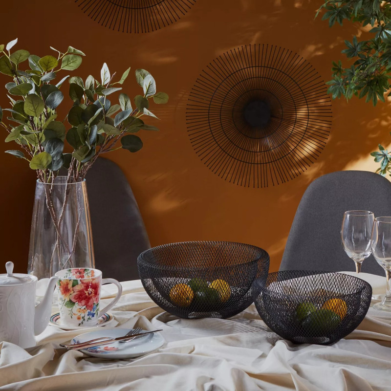 ظرف دکوراتیو مشکی HOME CENTER این سبد فلزی شیک و مدرن، مناسب برای میوه یا نان طراحی شده و با طراحی توری مشبک، جلوه‌ای زیبا به آشپزخانه یا میز پذیرایی شما می‌دهد. طراحی مدرن  این سبد با ساختار توری باعث گردش بهتر هوا می‌شود. این محصول به دلیل طراحی زیبا و کیفیت بالا، گزینه‌ای عالی برای دکوراسیون مدرن است.
