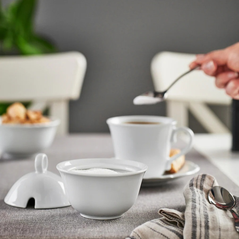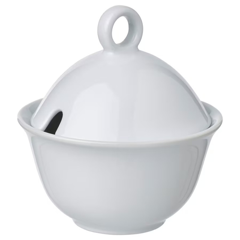 ظرف شکر ایکیا مدل UPPLAGA رنگ سفید، از چینی فلدسپات تولید می‌شود و به‌صورت تکی به بازار عرضه می‌گردد. این محصول برای نگهداری و سرو شکر در مقدار موردنیاز کاربرد دارد. روی درب این ظرف یک سوراخ کوچک برای قرارگیری قاشق درون آن تعبیه‌شده است. وزن سبک و طراحی ساده از ویژگی‌های قابل‌مشاهده این محصول هستند. جنس ظرف سرو شکر در برابر ضربه مقاوم بوده و دوام زیادی خواهد داشت. می‌توانید از این ظرف برای مصرف روزانه استفاده نمایید و جهت شستشو نیز آن را در ماشین ظرف‌شویی قرار دهید. روی درب یک حلقه برای بازکردن راحت آن قرار دارد که اتفاقاً به زیبایی محصول نیز می‌افزاید.ظرف چینی شکر ابعاد جمع‌وجوری دارد و با طرح گرد خود، ظاهری بامزه در کنار سایر وسایل صبحانه خواهد داشت. شکر را درون این ظرف بریزید و برای شیرین‌کردن چایی یا قهوه‌تان مقدار دلخواه و مناسبی از شکر را به کمک یک قاشق کوچک از درون ظرف برداشته و با نوشیدنی‌تان ترکیب کنید.